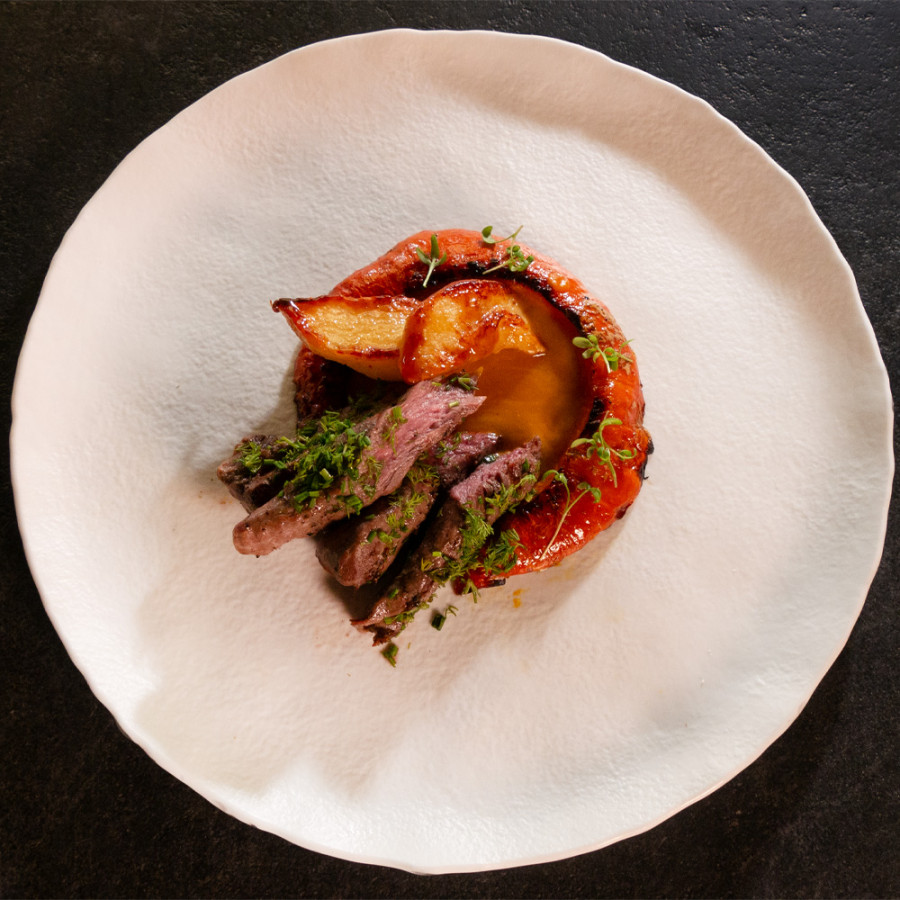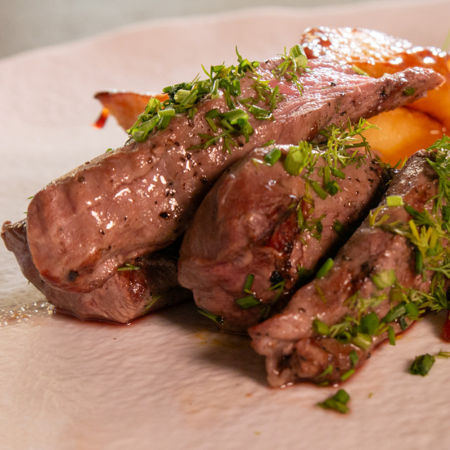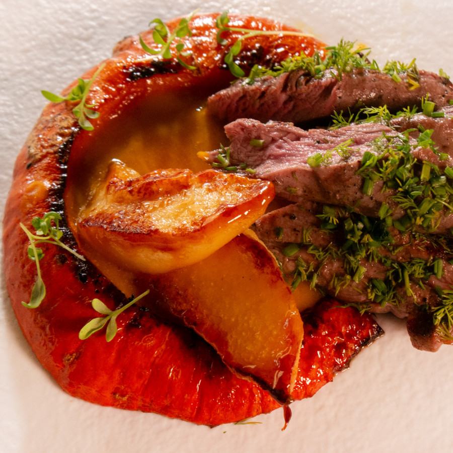 Агнешко бонфиле, приготвено на жар, печена тиква хокайдо и поширани дюли (350 г) Алергени: мляко (лактоза)