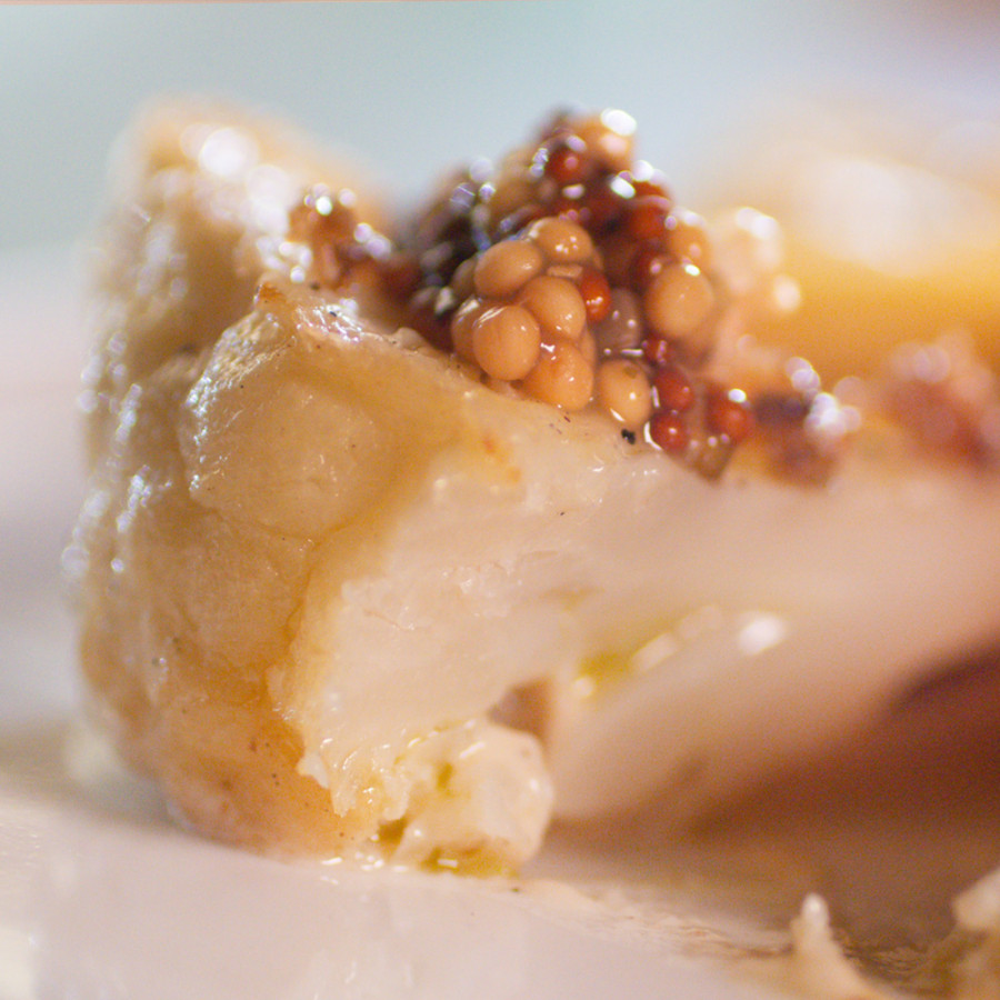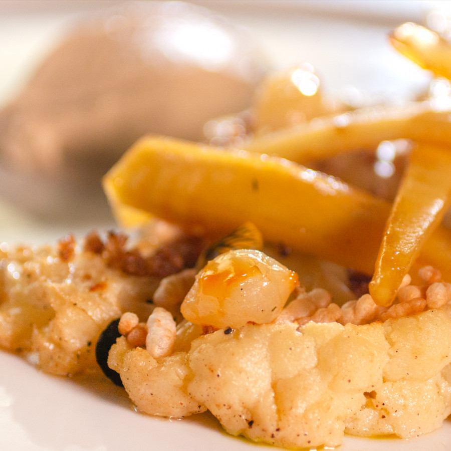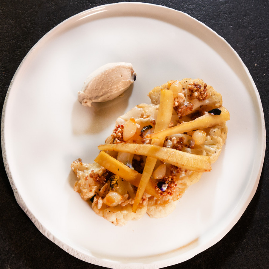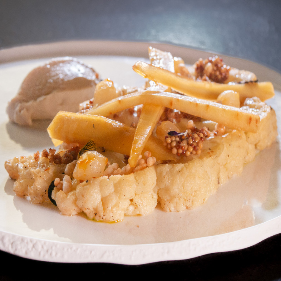 Стек от карфиол, готвен бавно на Sous-vide, с крем от лешници, перлен лук и печен пащърнак (300г) Алергени: ядки, мляко (лактоза) / VEGETARIAN