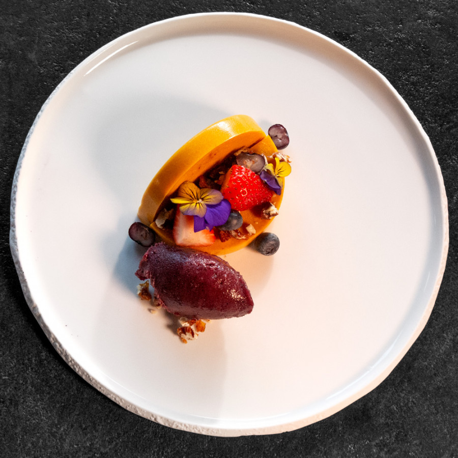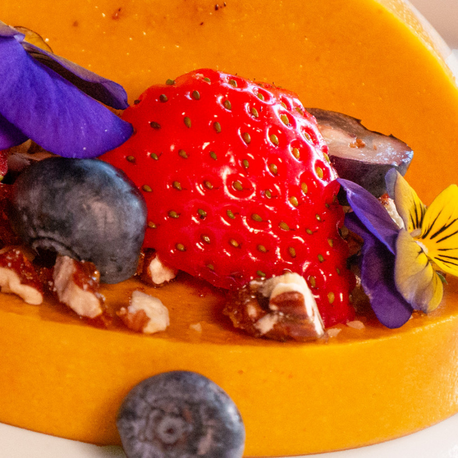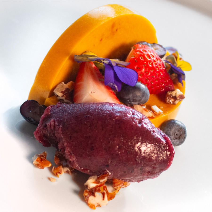 Веган панакота с тиква Хокайдо и кашу, сорбе от боровинки и карамелизиран пекан (150 г)