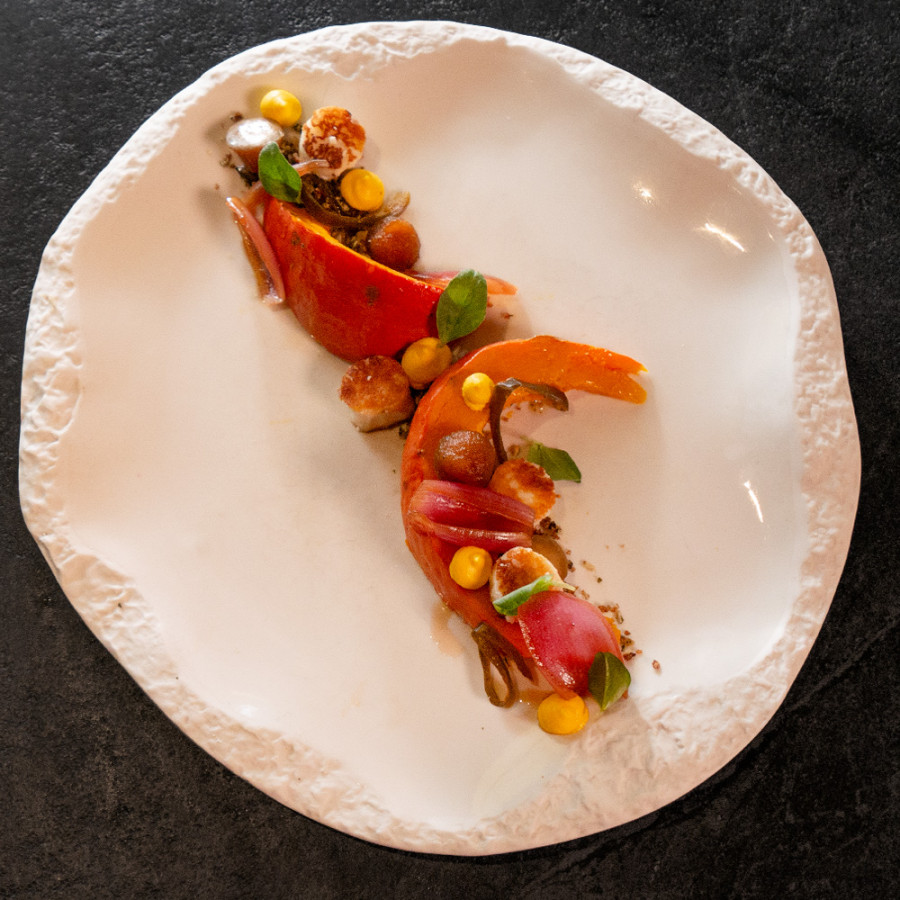 Салата с печена тиква хокайдо, глазирана с печени тиквени семки, козе сирене, трохи от пълнозърнест хляб, мариновани зелени ябълки и лук шалот (300 г) Алергени: глутен, мляко (лактоза)